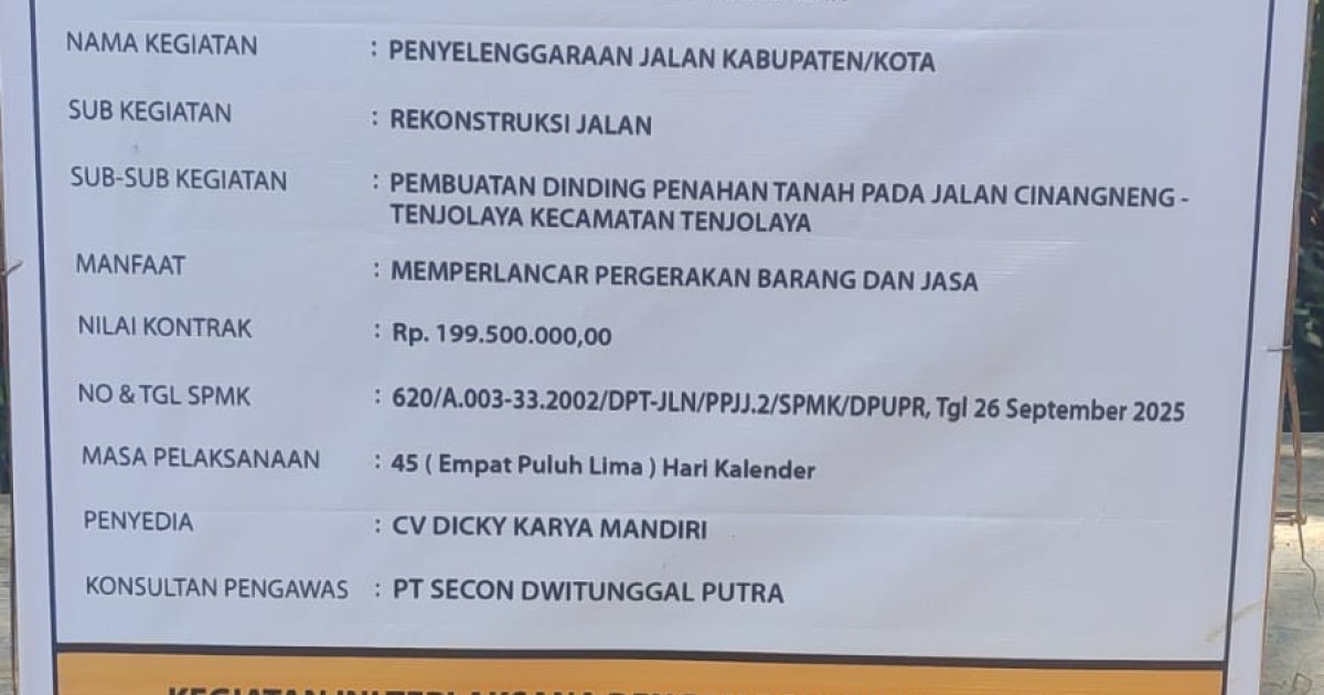 Berdasarkan papan informasi proyek, pekerjaan tersebut bernilai Rp199.500.000 dengan penyedia jasa CV Dicky Karya Mandiri dan konsultan pengawas PT Secon Dwitunggal Putra. Proyek ini merupakan bagian dari Program Penyelenggaraan Jalan, subkegiatan rekonstruksi jalan berupa pembuatan DPT.